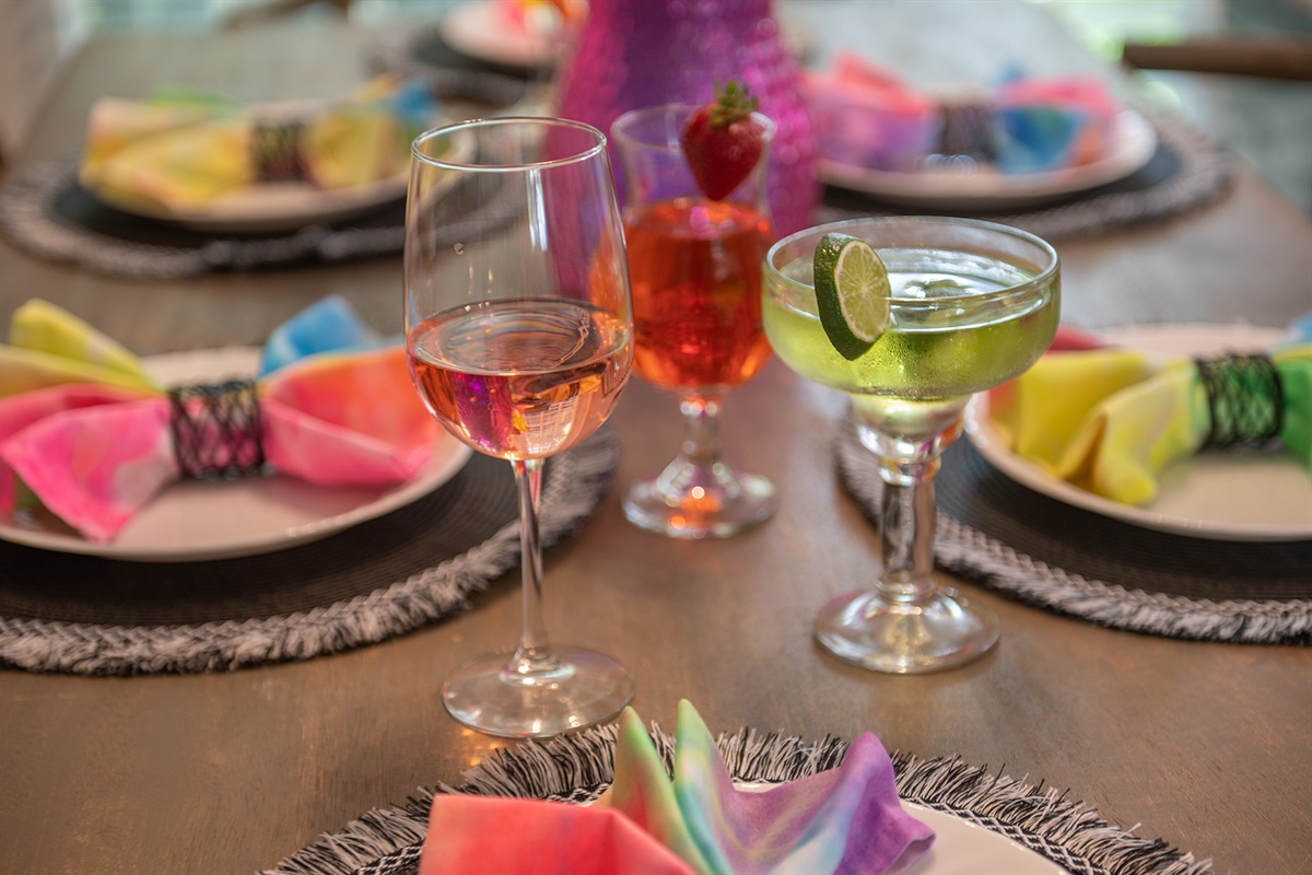 Our guests love the unique decor of the common space. Enjoy the fun, eclectic vibe provided by the carefully chosen furniture and artwork while you spend quality time with your family or friends in the living room and dining area. The muted tones of the furniture are complemented by pops of color for an eye-catching finish.